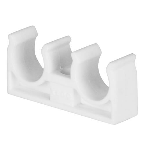 Опора TEBO двойная — пара клипс на общей базе для параллельной укладки двух труб PP-R (холодная/горячая, подача/обратка). Выпускается как скользящая (даёт продольный ход для компенсации удлинений) и фиксированная (жёсткая привязка узла у арматуры, поворотов, компенсаторов). Конфигурации: одинарная планка, усиленная планка, варианты под саморез/дюбель, под резьбовую шпильку/консоль; доступны дистанционные втулки/прокладки для выравнивания по отделке. Диаметры обычно Ø20–63 мм; рабочая среда — ХВС/ГВС и отопление; материал — ударопрочный полимер + оцинкованный крепёж, стойкий к влаге и бытовой химии.