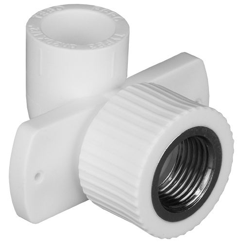 Угольник TEBO комбинированный ВН с креплением для гипсокартона — PP-R фитинг для поворота на 90° с переходом на внутреннюю резьбу (ВР) и жёсткой фиксацией в перегородках из ГКЛ. Конструкция: раструб под пайку PP-R + никелированная латунная вставка с резьбой G ½″ (ВР) и монтажная площадка/лапки для крепежа к закладной (профиль/фанера). Обеспечивает точное положение точки водоразбора, не корродирует и не зарастает; применим в ХВС/ГВС и отоплении. Типовые режимы для PP-R: до +95 °C (кратковременно до +100 °C), класс давления PN20–PN25; диаметры пайки Ø20–32 мм (зависит от исполнения).