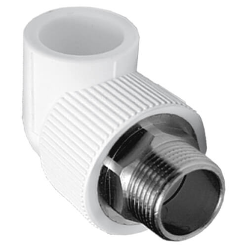 Угольник TEBO комбинированный НАР — поставка и монтаж “под ключ”. Переходный PP-R фитинг для поворота трассы на 90° с выходом на наружную резьбу (НР, G ½″–2″): раструб под пайку PP-R + никелированная латунная вставка. Применим в ХВС/ГВС и отоплении; типовые режимы для PP-R: до +95 °C (кратковременно до +100 °C), класс давления PN20–PN25, диаметры пайки Ø20–63 мм